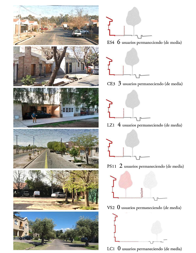 Para la obtención de los datos in situ de las unidades de la muestra se realizó el trabajo de campo durante dos días de invierno y cuatro días de verano. Se midió la vitalidad urbana a través de la observación no participativa del flujo peatonal y de la permanencia, realizada mediante el dibujo a mano en fichas diseñadas para tal fin. Las observaciones se realizaron a las 11 y a las 17:30 horas en invierno y a las 11, 13 y 19 horas en verano. Las encuestas sobre el uso de los patios de las viviendas se hicieron a vecinos de los barrios en cualquier momento de esos días. Los datos se plasmaron en un total de 260 fichas y 177 encuestas. Utilizando estadística descriptiva, se han trabajado en primer lugar las correlaciones entre variables paramétricas, estableciendo como correlación moderada un coeficiente igual o mayor a 0,70 (Sayed et al., 2014). En segundo lugar, se han explorado las relaciones entre los factores cualitativos y los cuantitativos, tratando de hallar cuáles están conectados y en qué medida.