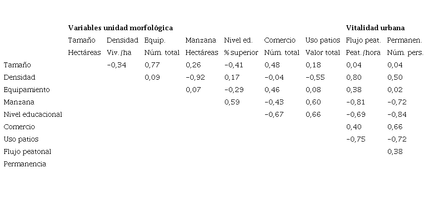 Los hallazgos indican que la vitalidad en las calles guarda relaciones con tres variables paramétricas (Tabla 3). En primer lugar, el flujo peatonal presenta una correlación significativa con la densidad habitacional, con un coeficiente de 0,80. Para el caso de la permanencia, el coeficiente de 0,50 no se considera suficiente como para establecer una relación sólida. La segunda variable es el tamaño de manzana, la cual presenta factores de correlación negativos de -0,81 y -0,72 para el flujo y para la permanencia. A saber, a manzanas más pequeñas, más vitalidad. En tercer lugar, el valor de recorribilidad o choice presenta una correlación de 0,83 con el flujo peatonal, retirando previamente los casos de GB2 y VS2, ya que, al ser barrios privados, se consideran una anomalía (outliers) dentro de la sintaxis espacial, puesto que los peatones no pueden circular libremente.