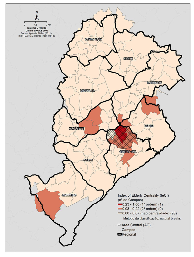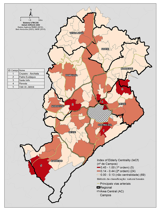 Observou-se que para os resultados não serem mascarados pelos altos valores de IeCfda AC, foi realizada também uma análise sem os Campos pertencentes à essa região. Os valores do Index of elderly Centrality foram representados em cartogramas (incluindo e excluindo a AC), com symbology graduated colors, a partir do método de classificação natural breaks (jenks) em três classes. Essas foram denominadas, respectivamente, do maior para o menor valor: a) Elderly Centrality de 1ª ordem (maior importância); b) Elderly Centrality de 2ª ordem (menor importância); c) Não centralidade.