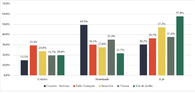 Nas elderly Centralities de 1ª ordem, as viagens a pé constituem o principal modo de deslocamento, com destaque para os Campos Vale do Jatobá e Santa Inês onde as viagens por esse modo correspondem a 57,8% e 47,2% dos deslocamentos diários, respectivamente. Para os demais, nota-se uma variação entre 30,2% e 37,6%, conforme apresentado na Figura 5. O uso do transporte coletivo (ônibus e metrô) também é notório, ainda que em menor proporção, principalmente no Padre Eustáquio (29,4%) e no Santa Inês (23,8%). Já no Cruzeiro-Anchieta e no Santa Inês, o transporte individual motorizado (automóvel e motocicleta) se destaca, correspondendo a 49,5% e 35,0% das viagens, respectivamente. Nas outras duas áreas esse modo de transporte não ultrapassa 30,1% das viagens. Essas práticas revelam uma geografia diferenciada que precisa ser observada com maior profundidade para poder construir uma política pública mais equitativa, levando em consideração as demandas dessa população.