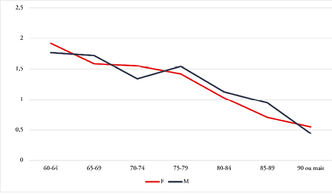 Em relação às dinâmicas de movimento, observa-se que os impactos significativos do envelhecimento na cidade estão associados à diminuição da presença da população idosa nos espaços públicos da cidade. É notória a diminuição da taxa de viagens à medida que a idade avança. Essa tendência é mais pronunciada quando se considera o gênero da população. Em geral, os homens idosos tendem a realizar mais deslocamentos. Apenas as mulheres entre 60 até 64 anos e entre 70 e 74 anos apresentam médias de viagens mais elevadas do que os homens. Embora essa diferença seja pequena, ela sugere uma maior imobilidade das mulheres na cidade, conforme apresentado na Figura 2.