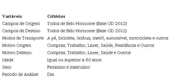 Conforme apresentado anteriormente, as hipóteses deste trabalho, que busca compreender as práticas de mobilidades da população idosa, estão fundamentadas nos seguintes pressupostos: a) existência de uma queda significativa nas taxas de viagens associada ao aumento da idade; b) maior diversidade de modos e motivos de deslocamento, que acarreta a formação de centralidades específicas dos idosos. A partir destas, foram caracterizados os deslocamentos realizados a partir de uma matriz de viagens, disponíveis na Pesquisa OD de 2012, segundo a amostra expandida. Além disso, a metodologia consistiu na identificação das áreas de maior atração de idosos (elderly Centralities), por meio da aplicação do Index of elderly Centrality (IeCf), baseado nos fluxos destes deslocamentos. Este é um indicador padronizado, fundamentado na análise do poder de atração de viagens de cada Campo, conforme definições e conceitos apresentados por Zhong et al. (2014) e Kneib e Silva (2014), que consideram subcentros espaços que atraem maior número de viagens. Nesse sentido, foi proposto o indicador elderly Centrality (eCf), cujo critérios de seleção dos fluxos estão indicados na Tabela 1.