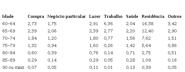 A população idosa difere da não idosa em relação aos motivos de viagem. Essa diversidade de motivos contrasta com a grande relevância das viagens obrigatórias no caso da população menor de 60 anos. Em termos agregados, o trabalho representa apenas 10% dos motivos de deslocamentos (Tabela 2). Entretanto, notamos diferenças nas dinâmicas de viagem conforme a idade avança. Até os 69 anos, há maior concentração de viagens relacionadas ao trabalho, proporção que diminui à medida que a idade avança. Compras e Lazer são o segundo e terceiro motivos de viagem entre o grupo etário estudado, com variações pequenas entre as faixas etárias descritas na Tabela 2. As viagens por motivo de saúde não têm proporção elevada, mas a variação também não é significativa nos grupos etários. Em geral, a redução mais acentuada das viagens entre os idosos ocorre após os 75 anos.