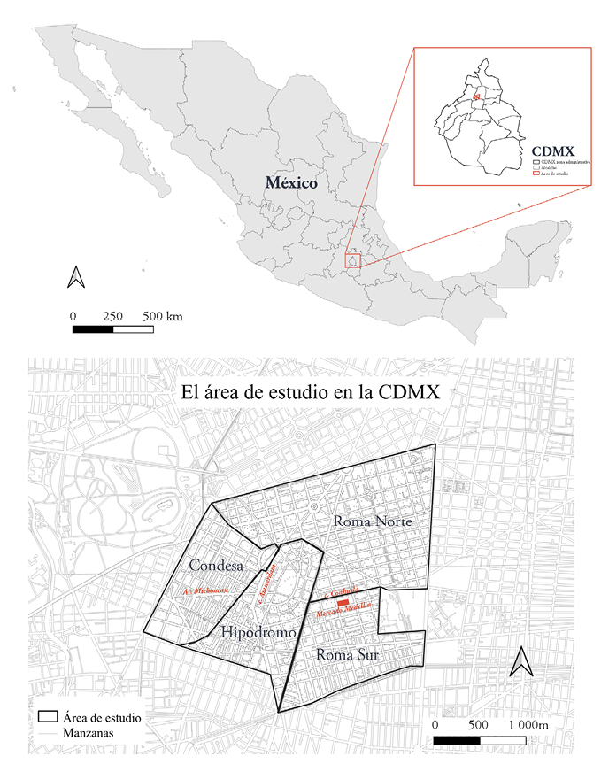 Con base en estudios previos de dos ciudades medias con reconocimiento UNESCO, reconversión económica turística y una importante presencia de poblaciones extranjeras (Navarrete Escobedo, 2017, 2020), se retomaron indicadores y métodos para el caso de la zona central de la CDMX. Se realizó una investigación de tipo mixto sobre la transformación urbana de cuatro colonias: Roma Norte, Roma Sur, Condesa e Hipódromo. Para comenzar, se exploraron las bases de datos de AirDNA con el fin de observar la evolución de Airbnb, esencial para la estancia de nómadas digitales (AirDNA, 2023). Se identificó su distribución espacial en las colonias analizadas. Posteriormente se consultó la evolución de los precios por metro cuadrado de departamentos nuevos y precios promedio de renta desde finales de 2019 a 2022 en sitios de agencias inmobiliarias (Century 21 México, 2023; Propiedades.com, 2023; Tecnocasa, 2023). Ambos indicadores fueron considerados por su impacto en el desplazamiento de poblaciones previas, locales y de menores ingresos en los años de pandemia y pospandemia.