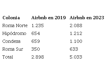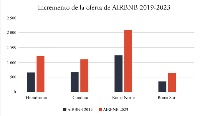 En 2023 se identificaron 5.033 registros vigentes de espacios de renta de vivienda turística, mientras ese número era 2.898 en 2019 (AirDNA, 2023) (Tabla 1). En la colonia Hipódromo se registró el mayor aumento de unidades de Airbnb en el periodo de pandemia, con un 85% más de viviendas en rentas turísticas. Le sigue la colonia Roma Norte, donde el aumento fue de un 70% de viviendas en Airbnb (Tabla 1). En conjunto, de diciembre de 2019 a enero de 2023 la vivienda en Airbnb aumentó 74% en las colonias Roma Norte, Roma Sur, Condesa e Hipódromo (AirDNA, 2023) (Tabla 1). Las cuatro colonias analizadas constituyen la mayor aglomeración de viviendas en Airbnb de la zona metropolitana de la CDMX. Las colonias vecinas, como la Juárez, la Escandón y la Cuauhtémoc, también presentan una progresión de Airbnb, aunque de menor intensidad (Figura 1).