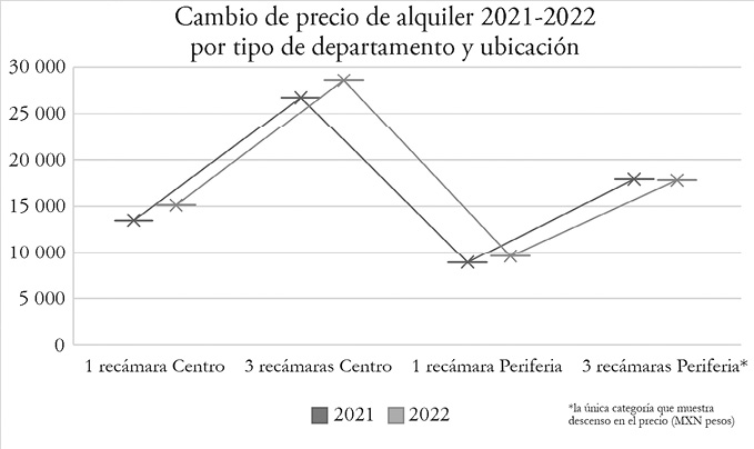 Las rentas de viviendas también han aumentado en la zona durante los años de la pandemia (Figura 3). Los departamentos de una recámara y de tres recámaras en la zona central a la cual pertenecen las colonias analizadas tuvieron un incremento promedio del 30% y del 15%, respectivamente. En 2019 el precio promedio de la renta de los departamentos de una habitación era de 11.670 MXN (583 dólares) en la zona central de la CDMX, mientras que en 2023 pasó a 15.115 MXN (755 dólares; es decir, un aumento del 30%. Para los departamentos de tres habitaciones el aumento fue del 15% en el mismo periodo (NUMBEO, 2023; Propiedades.com, 2023).