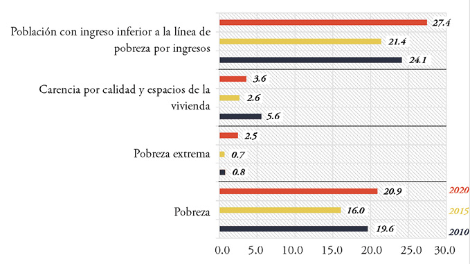 En cuanto al encarecimiento del costo de vida de las colonias analizadas y su impacto sobre el desplazamiento, exclusión y/o pauperización de poblaciones locales, observamos una coincidencia temporal entre la mutación económica por la presencia de nómadas digitales y el aumento de tasas de vulnerabilidad de ingreso, falta de vivienda digna y de calidad, para la población local de clases populares. Según los datos del Consejo Nacional de Evaluación de la Política de Desarrollo (CONEVAL), el número de personas en las colonias analizadas que declararon falta de vivienda digna pasó de 2,6% a 3,6% entre 2015 y 2020 (Figura 5). El número de habitantes que declararon una vulnerabilidad de ingreso pasó de 21,4% a 27,4% en el mismo periodo (CONEVAL, 2023). La pobreza y la pobreza extrema tuvieron también un incremento significativo (Figura 5). Los datos muestran igualmente que el año 2015 registró un mejoramiento de las condiciones de la población en comparación con 2010. Luego un retroceso de 2015 a 2020. El año 2015 coincide con la popularización de Airbnb en la CDMX.