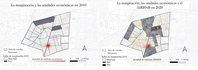 En la Figura 6 observamos que la marginación de las colonias en el área de estudio también se agudizó. El deterioro de las condiciones socioeconómicas es un proceso complejo que depende de muchos factores. Sin embargo, el encarecimiento general del costo de vida y la convergencia de los nómadas digitales coincide espacialmente con la disminución del bienestar socioeconómico de los locales. Podemos observar en los polígonos con escala de grises la intensidad de la precariedad que rodea las principales aglomeraciones de Airbnb y de comercio dirigido a poblaciones flotantes y de alto nivel de ingreso.