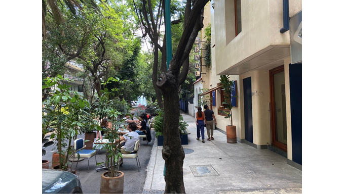 La privatización del espacio público es otro cambio visible producto de la presencia de nómadas digitales (Thompson, 2019). Tampoco es nueva, considerando que en ciudades como Quito, Guanajuato, San Miguel de Allende y Mérida, los gentrificadores transnacionales jubilados y el turismo tomaron para su consumo las más importantes plazas, calles y espacios patrimoniales desde antes de la pandemia (Hayes, 2018; Hernández Cordero & Díaz Parra, 2022). El estilo de vida de los migrantes transnacionales es muy afín al consumo de alimentos y bebidas en terrazas, calles y plazas. En barrios centrales de la CDMX, antes de la pandemia por Covid-19 este fenómeno era más discreto y restringido, pero con las políticas de distanciamiento social y con el objetivo de apoyar la actividad comercial se permitió la expansión de las actividades de consumo al espacio público (Santos Cid, 2022). En las colonias Roma Norte, Roma Sur, Condesa e Hipódromo, la ocupación de aceras, calles y parques para consumo de restaurantes se multiplicó. Los dispositivos de adaptación espacial implican estructuras desmontables y semifijas que privatizan el espacio urbano para uso de un perfil socioeconómico alto, que incluye un número importante de extranjeros (Raziel, 2023b).