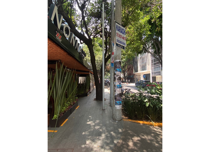 En el reconocimiento fotográfico de la zona de mayor concentración de unidades económicas del DENUE se muestra la expansión de las prácticas de consumo en calles, banquetas y espacio público (Figura 7 y Figura 8). Se identificaron estructuras metálicas y de madera, mobiliario de restaurantes, plantas y macetas para delimitar las áreas de servicio de los cafés, bares y restaurantes. En algunos puntos, como la calle Michoacán entre el parque México y el circuito Ámsterdam, la saturación de la circulación peatonal fue crítica debido a que en varios puntos se dejaban menos de 90 centímetros libres en banquetas (Figura 8).