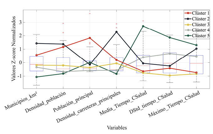 Así, los resultados obtenidos se pueden visualizar geográficamente en el mapa de clústeres, mostrado en la Figura 7, donde se observa cuáles comarcas guardan similitudes entre sí. Este mapa viene acompañado de la representación tabulada de valores promedio no normalizados de las variables representativas de cada clúster (Tabla 1) y de la distribución de estadística de cada variable mediante diagramas de caja y bigotes (Figura 8).