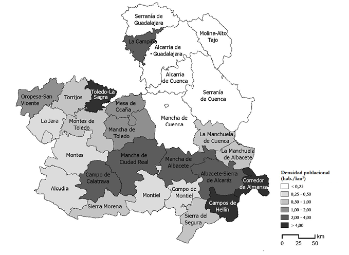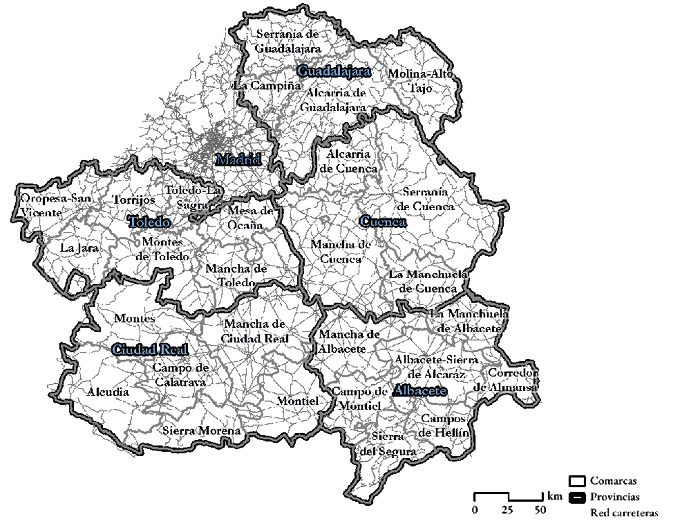 En la actualidad, la región cuenta con cinco provincias, las cuales a su vez se subdividen en 28 comarcas (Figura 1), en donde se encuentran los 919 municipios, de los que 639 (casi el 70% del total) tienen una población inferior a los mil habitantes (Figura 2). Estos se concentran principalmente en las provincias de Cuenca y Guadalajara, mientras que los municipios más poblados se encuentran en las zonas limítrofes del área metropolitana de Madrid (partícipes de muchas de las dinámicas metropolitanas), así como en la zona de La Mancha (zona central de la Comunidad Autónoma de Castilla-La Mancha).