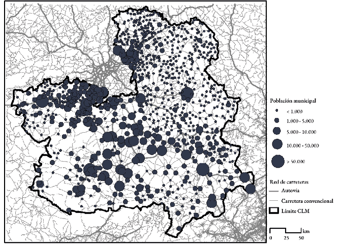 Esta investigación se centrará en la Comunidad Autónoma de Castilla-La Mancha, como una de las regiones españolas más involucradas en los procesos de despoblación y retos demográficos. En cuanto a la estructura y organización territorial, que resulta esencial para entender la dinámica entre áreas rurales y urbanas, se observa en Castilla-La Mancha una dinámica policéntrica, en la que se refleja una serie de núcleos urbanos o centros de actividad que actúan como nodos de empleo, comercio y otros servicios (Cañizares Ruiz & Martínez Sánchez-Mateos, 2014; Pillet et al., 2018). Su coexistencia en una región resulta en una estructura urbana distribuida, en lugar de tener un único centro dominante, lo que marcará las interacciones entre todos los núcleos poblacionales. Las ventajas de este modelo policéntrico incluyen la distribución de la congestión, la optimización de las infraestructuras de transporte y una mejor accesibilidad a servicios y oportunidades de empleo (Escolano Utrilla, 2018).