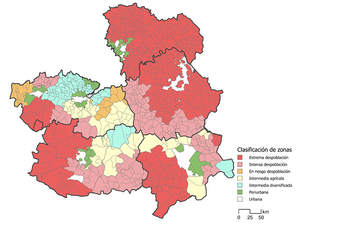 Estas diferencias en cuanto a estructura territorial y necesidades de desarrollo se han reflejado en la “Estrategia frente a la Despoblación en Castilla-La Mancha 2021-2031”, en el marco de la Ley de medidas frente a la despoblación 2021, cuyo objetivo principal es “atender los cambios demográficos presentes y futuros en Castilla-La Mancha y garantizar la funcionalidad de las zonas menos pobladas, dando respuestas a las necesidades de la población en materia de movilidad, conectividad, emprendimiento o prestación de servicios públicos” (Gobierno Castilla-La Mancha, 2020). En esta estrategia se definen áreas de la región, identificando el riesgo frente a la despoblación que sufren (Figura 3). Como puede observarse, gran parte de la superficie de la región se encuentra en riesgo de “extrema o intensa despoblación”. Solamente las zonas periurbanas asociadas a las capitales de provincia, alguna otra ciudad importante y la zona central conocida como La Mancha, quedan excluidas de las zonas de riesgo.