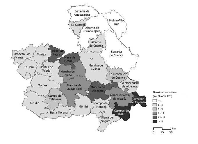 Tal y como se menciona en la presentación de la metodología, para la identificación de tipologías estructurales dentro de Castilla-La Mancha se empleó una serie de variables características de las comarcas de la región. Se trata de territorios que presentan una variabilidad notable en términos de densidad poblacional y de infraestructura viaria, así como de distribución de servicios básicos, como se evidencia en las figuras adjuntas. La Figura 4 ilustra la densidad poblacional, revelando una mayor concentración en ciertas áreas cercanas a Madrid, capital de España, y en el corredor de conexión desde la misma hacia la costa del mar Mediterráneo. Por el contrario, destacan zonas con densidades de población extremadamente bajas, especialmente en las provincias de Guadalajara y Cuenca, y también al oeste y sur de la región, con valores inferiores a 0,5 hab./km2. Por otro lado, la Figura 5 muestra la densidad de carreteras principales, un indicador clave de la conectividad regional y el acceso a servicios y oportunidades. Aquí, las zonas con una densidad superior a 17 km/km² se correlacionan con áreas de actividad intensificada a nivel regional y una mayor población, generando una ruta con mayor densidad evidente en el corredor Madrid-Levante, anteriormente mencionado.