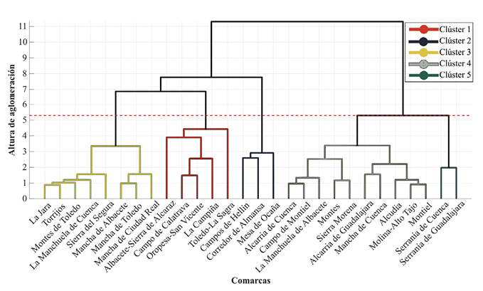 El dendrograma presentado ilustra la agrupación jerárquica de las comarcas estudiadas, resultando en la identificación de cinco clústeres distintos (Figura 6). Estos clústeres se determinaron mediante la aplicación de un criterio de corte en la altura de aglomeración, en este caso de 5,48 unidades, como se indica con la línea roja discontinua en la figura. Este nivel se eligió para maximizar la similitud (homogeneidad) dentro de los clústeres y la disimilitud (heterogeneidad) entre ellos.