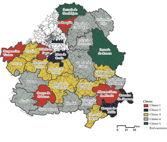 Una vez calculadas estas y otras variables características, se lleva a cabo el análisis clúster jerárquico de Ward. Tras emplear los métodos anteriormente descritos en la sección de metodología, se identificaron cinco tipologías de estructuras territoriales en Castilla-La Mancha. Cada una de estas tipologías presenta características distintas en términos de población, servicios y accesibilidad respecto a las demás.