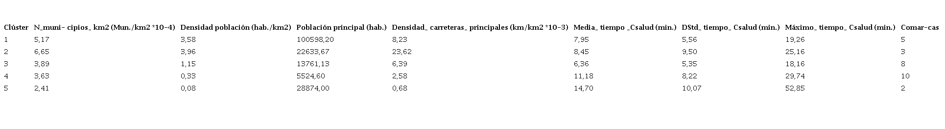 Clúster 5 – Zonas rurales con muy baja accesibilidad a servicios básicos. Este clúster incluye solamente dos comarcas y representa un caso particular, y más extremo, del clúster anterior. Las densidades de población y de carreteras principales son extremadamente bajas, con valores promedio de 0,077 hab./km2 y 6,8·10(-4) km/km2, que representan los valores más bajos de toda la muestra. Los tiempos promedio y máximos para llegar a los centros de salud son muy altos, alcanzando casi los 15 minutos de media y más de 50 minutos en los casos más extremos, lo que indica un acceso muy limitado a servicios básicos; en este caso, de salud. Este clúster representa, junto con el anterior, las comarcas con los mayores desafíos en términos de accesibilidad.