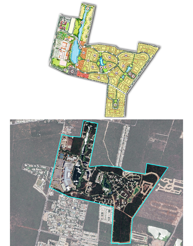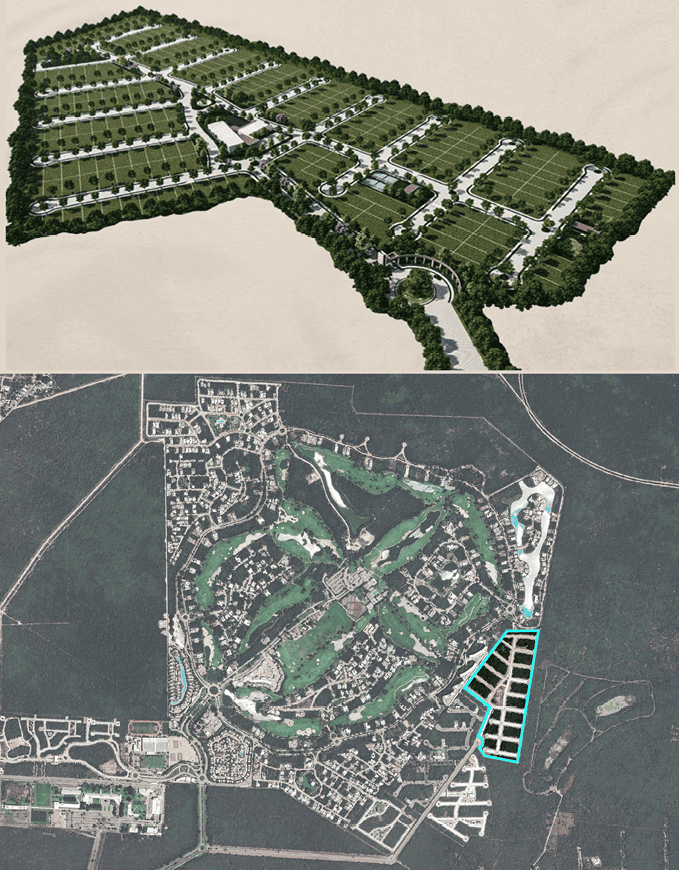 La Figura 4 muestra la Privada Residencial Antigua dentro de los límites del Yucatán Country Club, un complejo con varios desarrollos y un campo de golf. Está integrada por 242 lotes, de los cuales los más pequeños son de 312 m² (https://viveantigua.com/). El diseño de esta privada nos muestra los componentes más importantes de una privada residencial: vialidad interior, con una entrada principal y vialidades secundarias de acceso a las residencias; casa club con amenidades para residentes, como canal de nado, asoleaderos, 7 bar, zona de coworking, gimnasio, etc.; lagos; y parques infantiles, parques deportivos y zonas de mascotas.