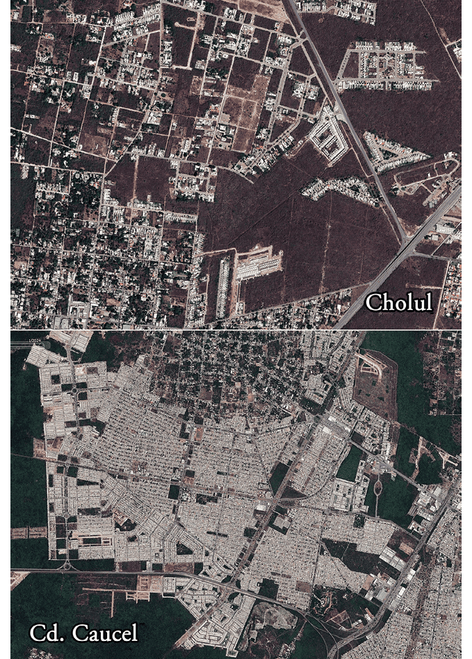 Los conjuntos de casas o casas individuales. Este segundo tipo ha tenido un fuerte incremento, y constituye lo que se denomina locamente como construcciones a pie de calle, ligadas a la población de alto poder adquisitivo; no son parte de una privada, sino el relleno de los espacios vacíos que amplía la mancha urbana y contribuye también a la expansión de los poblados tradicionales. Es común que en la periferia de estos últimos se advierta la mezcla de residencias de clase media alta con las viviendas tradicionales de los antiguos poblados; un ejemplo típico es el pueblo de Cholul (Figura 5). Estos desarrollos son una opción algo más barata que las privadas, porque no hay gastos de mantenimiento y los terrenos pueden ser de menor precio.