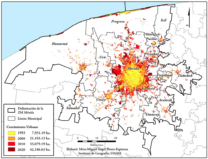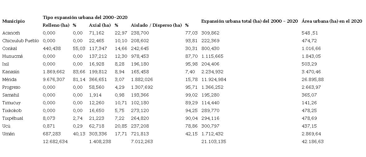 En esta expansión periférica no se aprecian manchones urbanos grandes, aunque sí se notan parches urbanos de escasas dimensiones, pero muy dispersos; la franja periurbana de Mérida es muy ancha en todas direcciones, a excepción de las zonas norte y oriente, en dirección al puerto de Progreso y el pueblo de Conkal. En el periodo 2000-2020 la expansión urbana fue de más de 21.000 hectáreas, con una tasa de crecimiento medio anual de 2,3%, mientras que el crecimiento de la población de toda la ZMM en el mismo periodo fue de 2,0%. Es decir, la mitad de la actual expansión urbana de la ZM tuvo lugar en los últimos veinte años. La densidad urbana registró una disminución de 46,0 hab./ha en 2000 a 43,9 en 2020. Las mayores expansiones urbanas se registraron en los municipios de Mérida (11.924 ha), Kanasín (2.234 ha) y Umán (1.712 ha) (Figura 1).