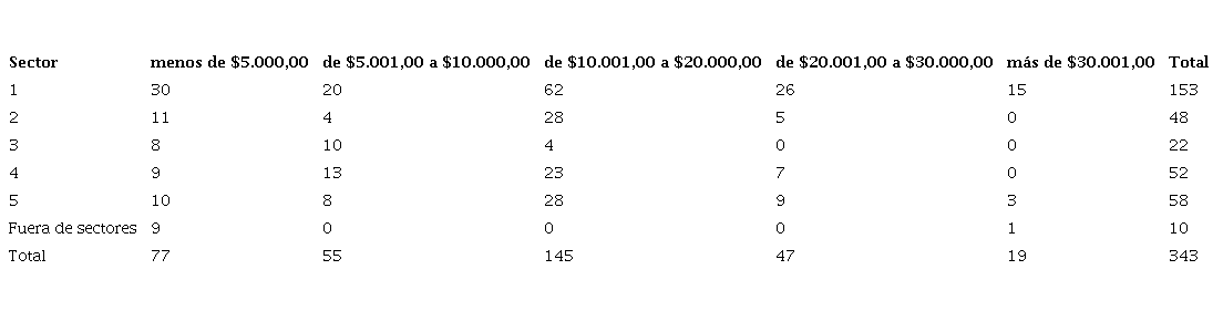 La Tabla 3 a continuación muestra los contrastes en el costo por metro cuadrado según localización por sectores: en los sectores 1, 2 y 5 se localizan los desarrollos con el metro cuadrado más caro; esto es, con precios en los rangos de 10.000 a 20.000 pesos y de 20.000 a 30.000, en 2023. Además, en el sector 1 se registran los desarrollos más caros, con un precio por metro cuadrado de más de 30.000 pesos. Por otra parte, en los sectores 3 y 4 se localizan los desarrollos de menor precio, sobre todo los de interés social de mayores magnitudes.