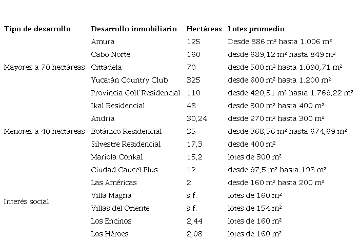 Los tamaños de lotes naturalmente varían, pero en promedio puede señalarse que los más pequeños van de 150 m² a 200 m² , particularmente en los desarrollos de interés social. En un segundo nivel, los lotes van de 300 m² a 600 m² aproximadamente; y en un tercer nivel, muestran superficies de 600 m² hasta más de 1.000 m². En la Tabla 2 se muestran las dimensiones de lotes de varias empresas privadas, donde se puede constatar las medidas señaladas.