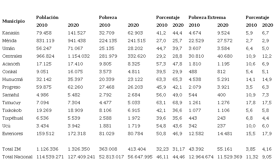 En referencia al segundo punto, el número de población pobre en toda la zona metropolitana aumentó de 363.008 personas en 2010, a 413.404 personas en 2020; es decir, un aumento de poco más de 50.000 personas. Este aumento se concentró en tres municipios, en orden de importancia según incremento de población pobre: Kanasín (30.194 personas), Mérida (17.380 personas) y Umán (3.067 personas). Cabe señalar que la población en pobreza extrema tuvo sus máximos incrementos también en Mérida y Kanasín.