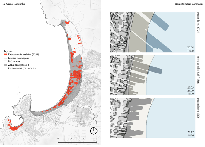 En la última etapa fueron discutidos algunos de los impactos sociales y medioambientales urbanos similares y distintos en las dos conurbaciones. También se discutieron las características de las tipologías urbano-turísticas y el modo en que se insertan en el espacio urbano, agudizando su fragmentación e impulsando la gentrificación. Con relación a los impactos sobre el medioambiente urbano, se analizaron los riesgos potenciales relacionados con la exposición a las amenazas naturales de las áreas urbano-turísticas de La Serena-Coquimbo y cómo las tipologías degradan la calidad espacial de los espacios públicos en las dos conurbaciones. Respecto a la incidencia de las amenazas naturales, y a modo de ejemplo, se realizó el cruzamiento de la ubicación de las zonas turísticas con la distribución espacial de las zonas de inundación por tsunamis, obtenidas en el Servicio Hidrográfico y Oceanográfico de la Armada de Chile (SHOA). Para analizar la calidad espacial de los microclimas urbanos, se realizaron simulaciones de la incidencia de la sombra de las edificaciones en la franja de arena en las cuatro estaciones del año en la situación más crítica (Itajaí-Balneário Camboriú) con auxilio del Mapbox. Otros impactos ambientales, como aquellos relacionados al consumo y disponibilidad de agua, también fueron abordados a partir de la consideración de estudios ya realizados.