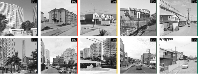 Las tipologías edilicias ilustradas en la Figura 9, cuando son evaluadas con relación al entorno, en general presentan poca interacción con el espacio público. Algunas tipologías tienen una relación más directa, como es el caso de T03, T04 y T05 en La Serena-Coquimbo, donde muchos establecimientos comerciales y residencias están abiertos hacia el espacio urbano; y T01, T02, T04 y T05 en Itajaí-Balneário Camboriú, donde no es raro tener edificios con instalaciones comerciales en el primer piso (T01 y T02) o residencias de un solo piso, en las que la calle es casi una extensión de la residencia (T04 y T05). En ambos casos, sin embargo, la existencia de numerosas edificaciones aisladas y amuralladas denota una tendencia al encerramiento y aislamiento con relación al espacio público. Las tipologías T01 y T02 en La Serena-Coquimbo y T03 en Itajaí-Balneário Camboriú se caracterizan por no tener relación con el espacio público, dada su conformación en grandes lotes y en bloques.