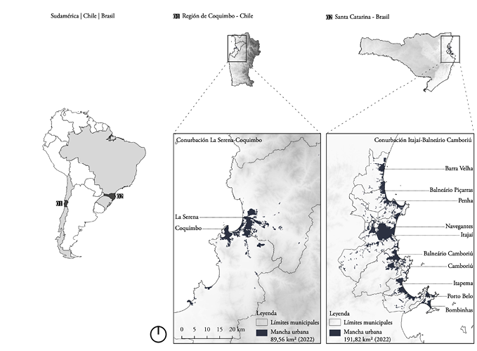 Las conurbaciones de La Serena-Coquimbo e Itajaí-Balneário Camboriú tienen características similares: en cuanto a la ubicación geográfica, se localizan en zonas costeras de latitudes intermedias de Sudamérica (29°54’S y 26°59’S, respectivamente); en el contexto de la realidad de Chile y Brasil son consideradas aglomeraciones urbanas de porte medio, con 448.784 y 867.626 habitantes, respectivamente (Instituto Nacional de Estadísticas [INE, Chile], 2017; Instituto Brasileiro de Geografia e Estatística [IBGE], 2022). Ambas presentan un crecimiento demográfico que supera las tasas nacionales del país en que se encuentran, y que las inserta como nuevos polos de movimientos migratorios y acumulación de riqueza; todo esto en el marco de un crecimiento impulsado por la urbanización turística.