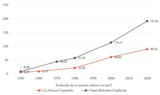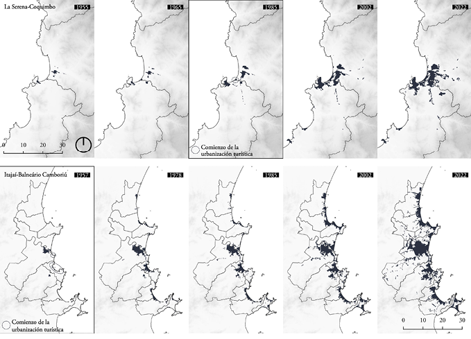 En el presente estudio se realizó un análisis histórico-espacial del proceso de crecimiento urbano en dos conurbaciones urbanas en latitudes intermedias de Sudamérica, pero ubicadas en la costa de dos océanos distintos. Debido a los cambios globales en la actividad económica y la condición de proximidad a la costa, a partir de mediados y finales del siglo XX se incorporan al contexto de estas localidades actividades turísticas de sol y mar y, principalmente, intensas transformaciones en el espacio urbano, como la expansión –y la consecuente conurbación de municipios vecinos–, junto con la aparición de nuevas tipologías edilicias, al mismo tiempo que se acentuaban las disparidades socioespaciales. Cuando se observa en conjunto el proceso de crecimiento histórico, los datos demográficos y la forma urbana resultante, destaca que la urbanización turística está más incorporada en el proceso de conurbación de Itajaí-Balneário Camboriú en comparación con lo que ocurre en La Serena-Coquimbo.