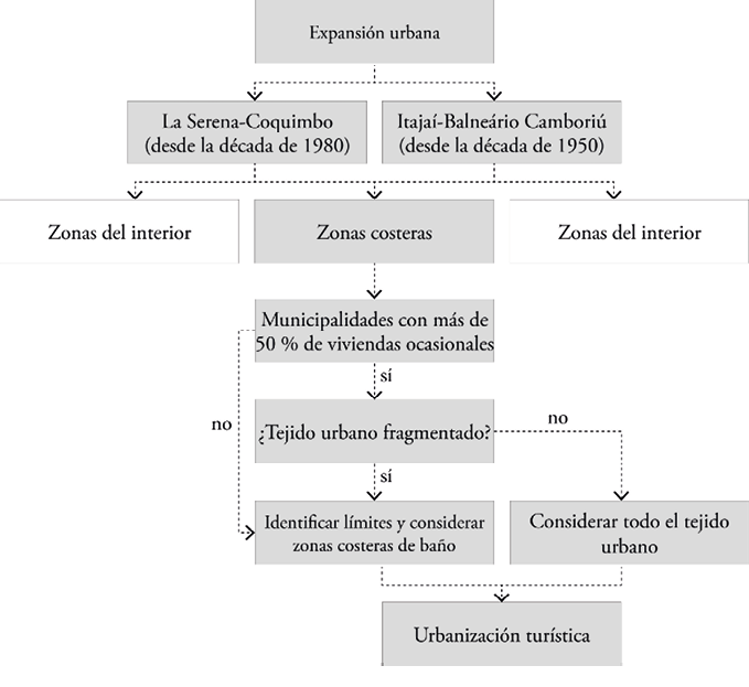 En la tercera etapa, se realizó un reconocimiento espacial en las dos conurbaciones en referencia. Primeramente, fueron identificadas las áreas que se desarrollaron bajo el modelo de urbanización turística, tomándose como criterio tres aspectos para su delimitación: 1) el temporal, considerando las zonas que surgieron a partir de la segunda mitad del siglo XX (en el marco de ese modelo de urbanización en Latinoamérica); 2) el espacial, considerando las localidades costeras cuya forma de turismo predominante en las dos regiones analizadas es el de sol y mar (González, 2016); 3) la proporción de viviendas habituales y ocasionales registradas en los últimos censos de Chile y Brasil. Las etapas para la delimitación de las zonas de urbanización turística están sistematizadas en el diagrama de la Figura 1.
