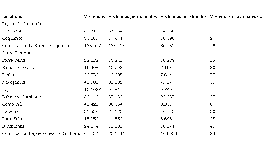 Una característica que puede ser utilizada para comprobar la importancia del turismo en el proceso de urbanización es considerar la proporción de viviendas de uso habitual y ocasional en el tejido urbano. La segunda vivienda (uso ocasional), definida como alojamiento empleado para el descanso y el ocio los fines de semana y/o durante las vacaciones (Tulik, 2001), presenta gran relevancia en la producción del espacio urbano turístico. De acuerdo con la Tabla 1, la conurbación de La Serena-Coquimbo destina, en la actualidad, 19 % de viviendas al uso ocasional (INE, 2017), en cuanto ese índice alcanza 24 % en Itajaí-Balneário Camboriú (IBGE, 2022), lo que evidencia su rol esencial en la expansión urbana de las dos localidades.