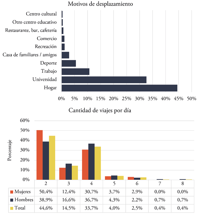 En general, los viajes realizados con vehículos motorizados propios de cada hogar representan el 37% del tiempo total empleado en desplazamientos, mientras que el 51% se realiza mediante otros modos de transporte y el 12% implica desplazarse caminando. A partir de estas cifras, surge la necesidad de detectar las razones por las cuales los estudiantes realizan sus viajes y la cantidad de desplazamientos que llevan a cabo cotidianamente.