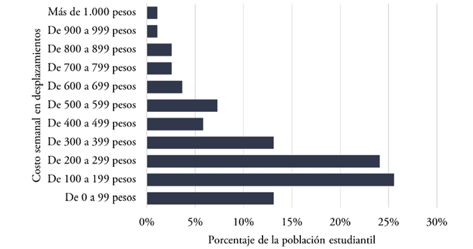 El volumen de viajes diarios no presentó relación con el gasto que invierten los estudiantes en sus desplazamientos, donde el 63% señalaron que gastan entre 100 y 400 pesos1 (Figura 4). Pero al comparar los datos con otras variables, se encontró que la situación laboral de los estudiantes influye en la cantidad de desplazamientos que realizan por día. Aquellos que efectúan más de 4 viajes diarios son los que tienen empleo, sea de tiempo completo o parcial, o se trata de trabajadores independientes, lo que refleja que la necesidad de realizar actividades adicionales a la educación influye en las veces que los estudiantes se desplazan cotidianamente.