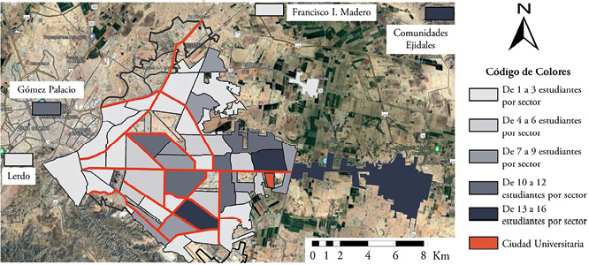 La encuesta aplicada permitió obtener información detallada y diversa sobre los desplazamientos cotidianos de los estudiantes de licenciatura de la Ciudad Universitaria. La Figura 1 describe, mediante sectores delimitados por las principales vialidades, los lugares de residencia de los estudiantes y la ubicación del campus universitario. El 82,3% de los estudiantes habitan dentro de la mancha urbana de la ciudad de Torreón; 9,8% provienen de las ciudades conurbadas de Matamoros, Gómez Palacio y Lerdo; y 2,5% provienen de los municipios de Francisco I. Madero y Viesca, localizados a 40 y 60 minutos en coche respectivamente. Se destaca un 5,4% de estudiantes que provienen de comunidades ejidales periféricas a la ciudad de Torreón, donde el acceso al transporte público es limitado.
