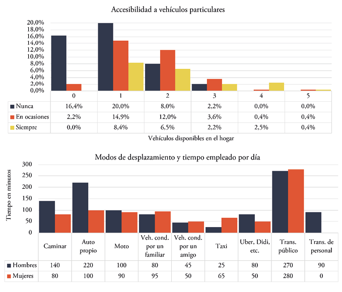 En la localización geográfica de los hogares no se advierte una tendencia de proximidad con el campus universitario. Esto es, no se lo elige por su proximidad con los hogares de los estudiantes. Siendo esta universidad de carácter público, su bajo costo de inscripción es el principal motivo para su elección como casa de estudios. De hecho, ella representa una oportunidad para la formación profesional de grupos poblacionales de ingresos limitados. La condición socioeconómica de estos sectores se refleja en la información sobre vehículos disponibles por hogar, que indica que casi la mitad de los estudiantes no tiene acceso a un vehículo particular (Figura 2). El 43,3% de los hogares cuentan con un solo vehículo para sus desplazamientos cotidianos, mientras que el 18,5% no disponen de este medio. La encuesta destaca a la vez que el 46,5% de los encuestados no tienen acceso a un vehículo para desplazarse y que el 33,5% lo llegan a utilizar ocasionalmente. En relación con estos datos, el modo de desplazamiento más utilizado es el transporte público (30%), seguido del uso del vehículo particular (17%) y, en tercer lugar, el caminar (12%) (Figura 2).