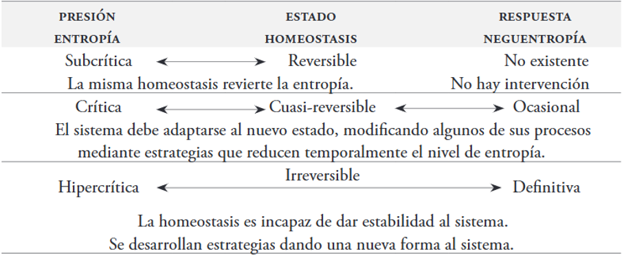 En su fase subcrítica, la entropía no inhibe el funcionamiento del sistema: es decir, este puede seguir operando, aun cuando se presentan anormalidades. En tal situación la homeostasis no es afectada severamente y, por lo tanto, puede revertir la entropía o minimizar sus impactos, produciendo sus propias neguentropías. En sistemas con fases críticas de entropía es necesaria la intervención de la neguentropía. En esta situación la homeostasis ha sido afectada con un mal funcionamiento del sistema y, por lo tanto, presenta dificultad para reducir la entropía, ocasionando que algunos de sus procesos no puedan regresar a su estado anterior o alcanzar un estado adaptativo. En los sistemas con entropía en fase hipercrítica la estructura del sistema no puede recuperar su estado anterior, constituyendo circunstancias que requieren de acciones de la neguentropía para reducir los niveles de entropía y alcanzar un estado estable.