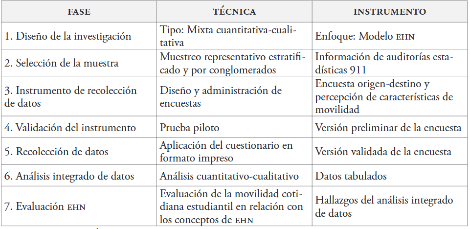 La aplicación de encuestas origen-destino, representaciones cartográficas, análisis estadístico y modelado son herramientas que permiten comprender y analizar los patrones de desplazamiento de grupos de personas –entre ellas, los estudiantes universitarios–, para una comprensión detallada de su movilidad cotidiana. La aplicación del enfoque EHN, en combinación con las técnicas anteriores, resulta plausible para el análisis y comprensión de la dinámica subyacente de este sistema, al permitir examinar las características y percepciones de los estudiantes en su movilidad cotidiana.