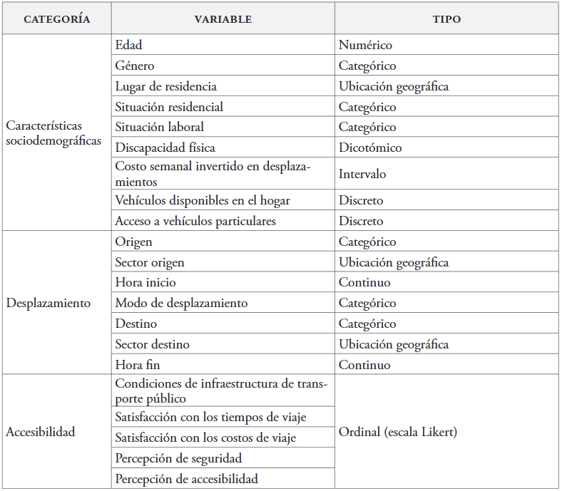 Para evaluar la movilidad cotidiana estudiantil, se diseñó el instrumento de investigación utilizando las siguientes variables de estudio (Tabla 4):