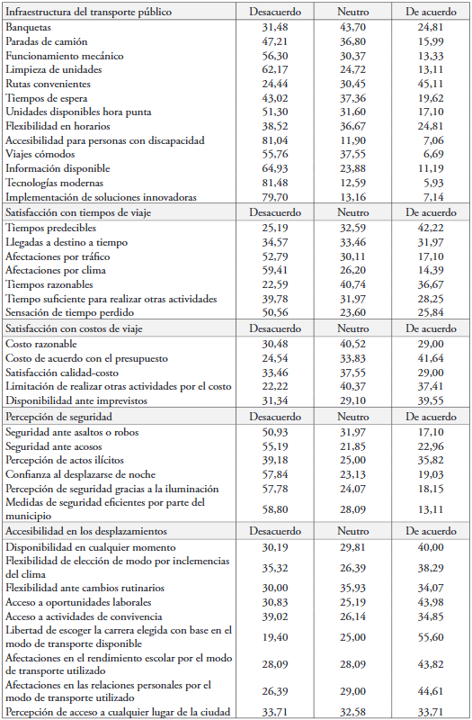Los resultados señalan que, en cuanto a la infraestructura del transporte público, existe deficiencia sobre el uso de tecnologías modernas y soluciones innovadoras, así como en relación con la disponibilidad de itinerarios sobre rutas y horarios. Además, indican que las unidades de transporte no cuentan con los accesorios necesarios para personas con discapacidad y que en su mayoría presentan desperfectos mecánicos. Varios de los comentarios abiertos que ofrecieron los estudiantes se refieren al mal comportamiento por parte de los choferes, así como la falta de limpieza de las unidades de transporte. Sobre los puntos positivos, los estudiantes perciben que existen suficientes rutas para poder desplazarse en la ciudad, aunque los tiempos de espera no son adecuados; señalan que en horas punta la cantidad de vehículos no es suficiente y que tienden a ir con sobrecupo.