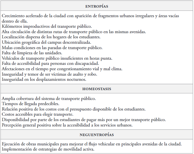 Si bien el modo más utilizado por la población estudiantil para desplazarse es el transporte público, este es poco accesible a las personas que tienen movilidad reducida. A ello se suma que suele presentar demoras, sufre de congestionamiento en horas punta, tiene baja cobertura en las áreas periféricas de la ciudad y bajos niveles de confort, su infraestructura es obsoleta y sus tiempos de viaje, excesivos. Todo ello redunda en que la entropía sea crítica, llevando la homeostasis del sistema de movilidad estudiantil a un estado cuasi-reversible –esto ocurre, según se ha dicho, cuando el sistema debe adaptarse al nuevo estado, modificando algunos de sus procesos mediante estrategias que reducen temporalmente el nivel de entropía–, lo que requeriría de acciones e intervenciones urgentes por parte de las autoridades municipales y estatales en el sistema del transporte público de la ciudad y su área metropolitana para lograr su adecuación a las necesidades de los usuarios.