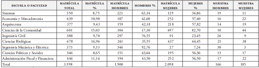Considerando un nivel de confianza del 95%, un coeficiente Z de 1,96 con un margen de error de 0,05 (García-García et al., 2013), y al no contarse con datos previos, se establecen los valores de p y q en 0,5. Se obtiene un tamaño de muestra de 351 estudiantes. Se realiza un muestreo por conglomerados (por escuelas) y estratificado (por sexo), asignando de forma proporcional las encuestas a cada escuela o facultad, obteniéndose la distribución que se detalla en la Tabla 3.