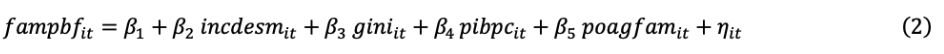 Na equação (2), que serve como proxy para a pobreza, com base em Chakravart (2009), sugere-se que o índice de Gini está positivamente relacionado ao número de beneficiários do Programa Bolsa Família, indicando que maior concentração de renda está associada a mais famílias pobres recebendo o benefício. A relação entre nível de renda e o número de famílias pobres contraria as expectativas. Há também uma correlação positiva entre a população envolvida na agricultura familiar e o número de beneficiários do Bolsa Família.