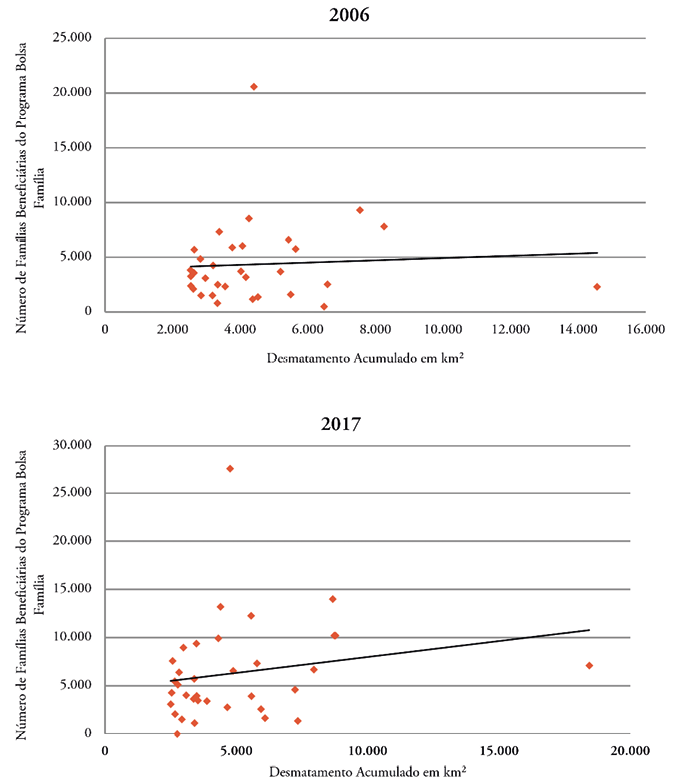 A Figura 3 analisa municípios com desmatamento acumulado de 2.500 km² ou mais em relação ao número de famílias beneficiadas pelo Programa Bolsa Família em 2006 e 2017. Em ambos os anos, observa-se que, com o aumento do desmatamento acumulado, cresce também o número de famílias beneficiadas, o que sugere uma associação entre desmatamento intenso ao longo do tempo e maior necessidade de assistência socioeconômica.