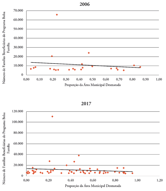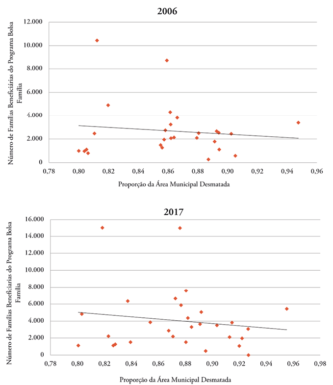Outro exercício empírico analisou a relação entre municípios com alta concentração de pobreza – medida pelo número de famílias beneficiadas pelo Programa Bolsa Família – e a proporção da área desmatada. Na Figura 4, municípios com 5.000 ou mais famílias beneficiadas foram correlacionados com a proporção de área desmatada em 2006 e 2017. Em ambos os anos, observou-se uma correlação negativa consistente, indicando que o aumento no número de beneficiários do PBF está associado a uma diminuição na proporção de área desmatada, sugerindo uma relação entre maior necessidade de assistência socioeconômica e reduzidos níveis de desmatamento.