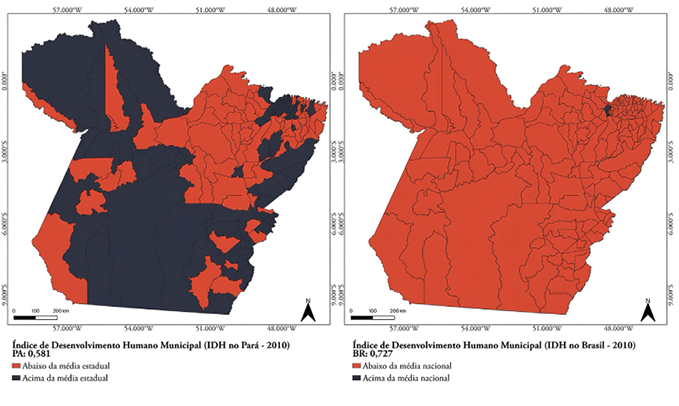 É crucial ressaltar que estabelecimentos rurais de até 10 hectares, predominantemente de origem familiar, frequentemente não geram renda suficiente para ultrapassar a linha de pobreza de ½ salário mínimo por pessoa. Essa condição de pobreza relativa no estado do Pará é corroborada pelo Índice de Desenvolvimento Humano Municipal (IDHM), com mais de 95% dos municípios do estado apresentando valores abaixo da média nacional, e muitos municípios com valores abaixo da média do próprio estado (Figura 1).