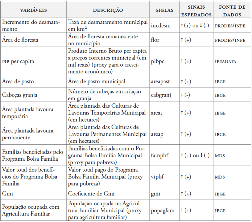 Conforme a literatura, o valor total do benefício do Programa Bolsa Família tem uma relação direta com a degradação ambiental. As áreas de pastagem, cultivo permanente, e cultivo temporário são esperadas estar positivamente correlacionadas com o desmatamento.