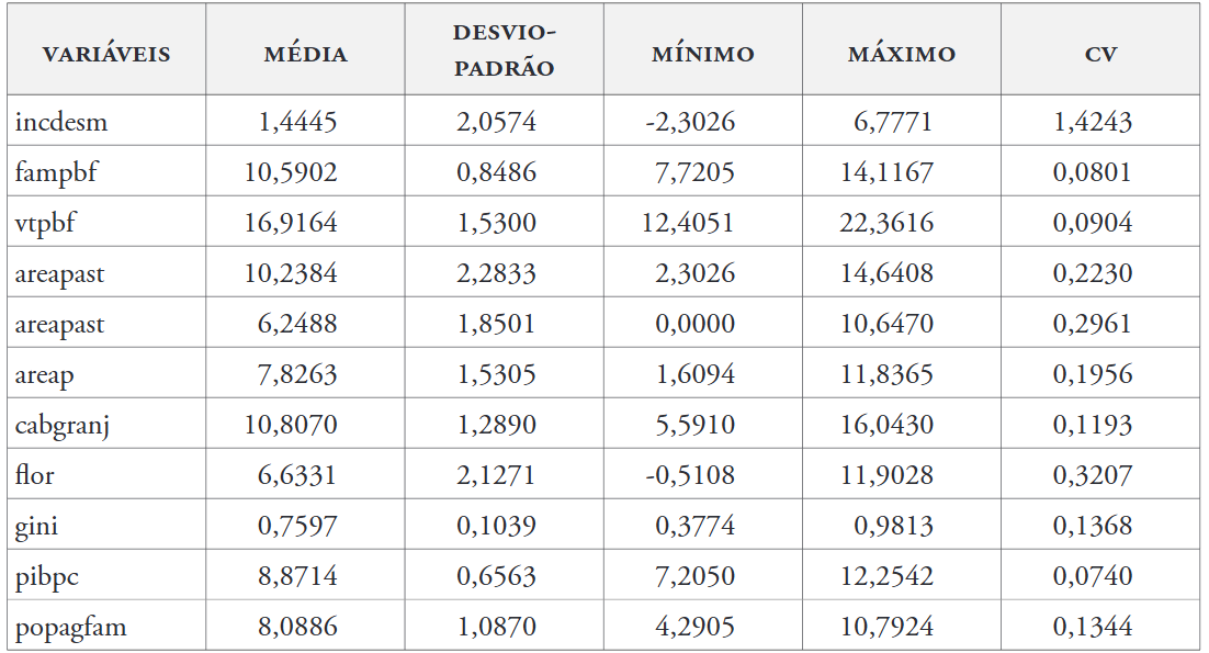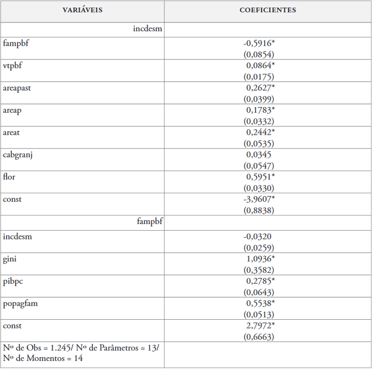 As variáveis incdesm e fampbf representam, respectivamente, a taxa anual de desmatamento e o número de famílias atendidas pelo Programa Bolsa Família, sendo esta última uma estimativa do número de famílias pobres. Ambas são consideradas endógenas e determinadas simultaneamente. Outras variáveis, como o valor total do benefício do programa Bolsa Família (vtpbf), área de pastagem (arapast), área de cultivo permanente (areap), área de cultivo temporária (areat), cabeças granja (cabgranj), área de floresta (flor), índice de Gini (gini), PIB per capita (pibpc) e população empregada na agricultura familiar (poagfam), são consideradas predeterminadas.